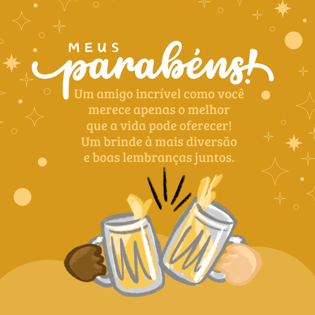 Um amigo incrível como você merece apenas o melhor que a vida pode oferecer! Meus parabéns, um brinde à mais diversão e boas lembranças juntos.
