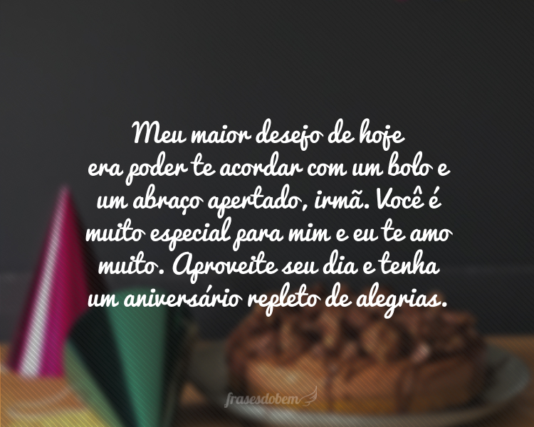 Meu maior desejo de hoje era poder te acordar com um bolo e um abraço apertado, irmã. Você é muito especial para mim e eu te amo muito. Aproveite seu dia e tenha um aniversário repleto de alegrias.