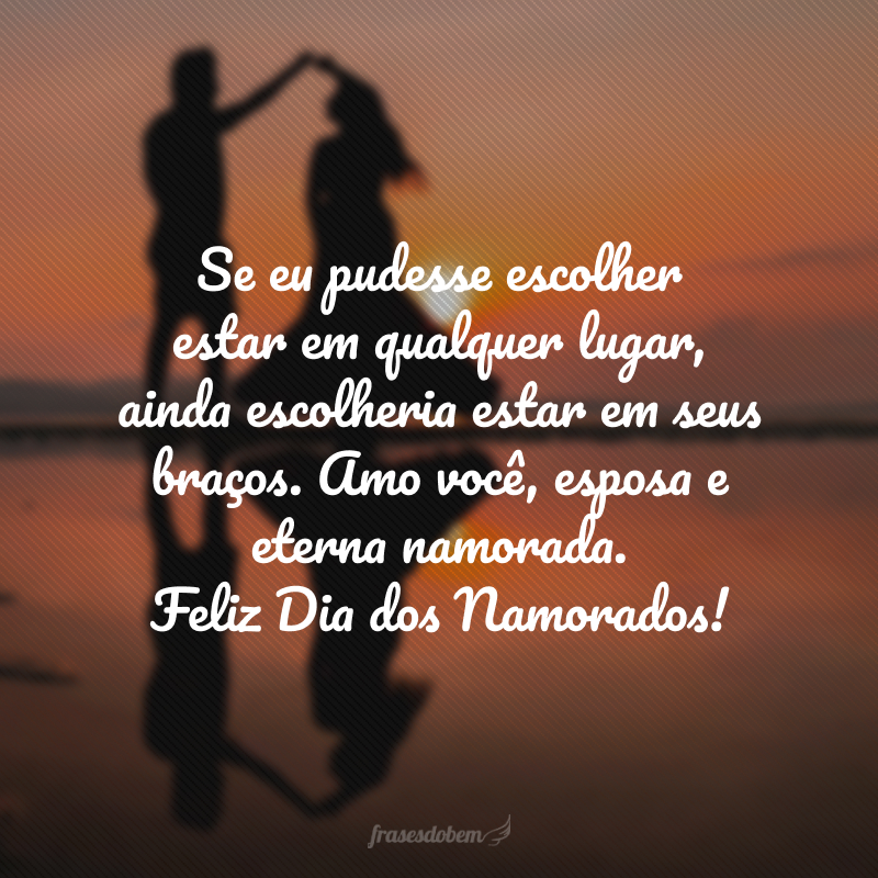 Se eu pudesse escolher estar em qualquer lugar, ainda escolheria estar em seus braços. Amo você, esposa e eterna namorada. Feliz Dia dos Namorados!