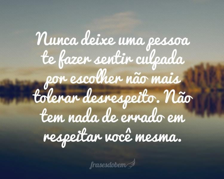 Nunca deixe uma pessoa te fazer sentir culpada por escolher não mais tolerar desrespeito. Não tem nada de errado em respeitar você mesma.