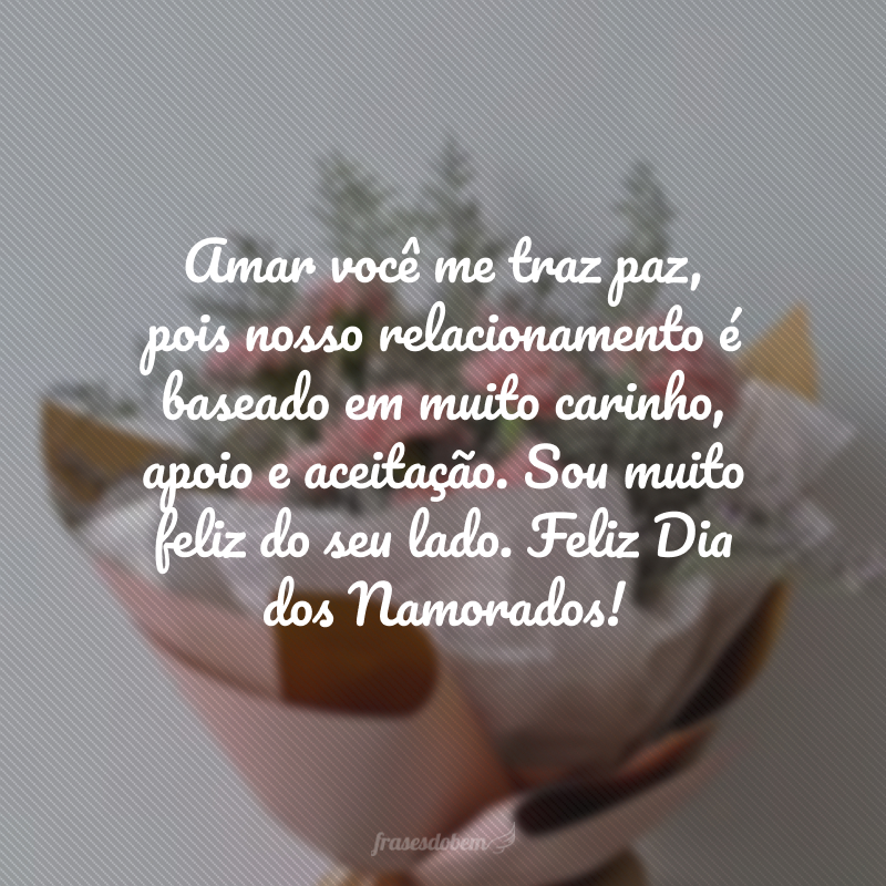 Amar você me traz paz, pois nosso relacionamento é baseado em muito carinho, apoio e aceitação. Sou muito feliz do seu lado. Feliz Dia dos Namorados!