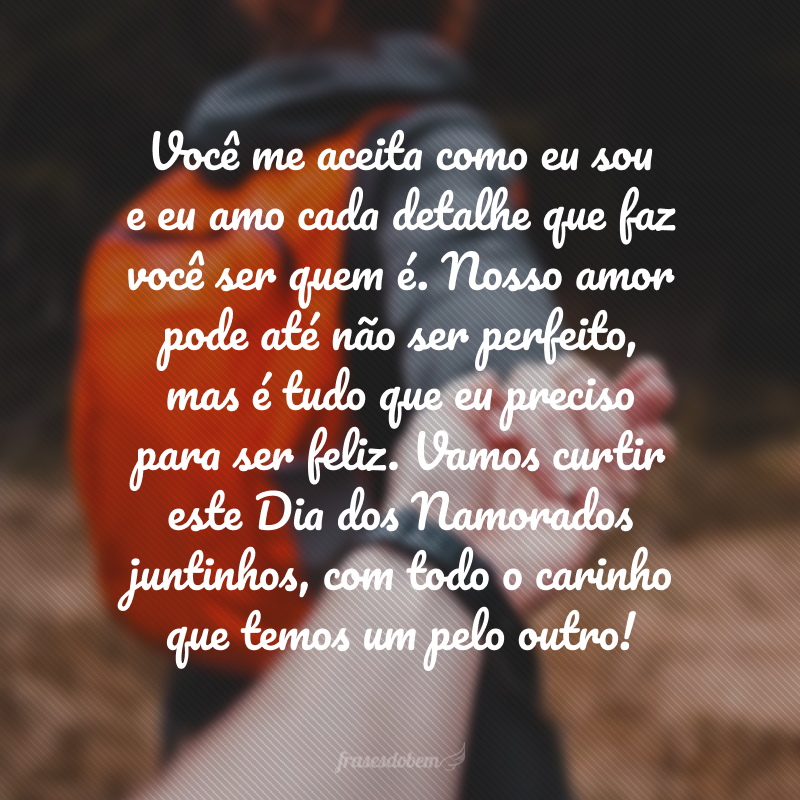Você me aceita como eu sou e eu amo cada detalhe que faz você ser quem é. Nosso amor pode até não ser perfeito, mas é tudo que eu preciso para ser feliz. Vamos curtir este Dia dos Namorados juntinhos, com todo o carinho que temos um pelo outro!