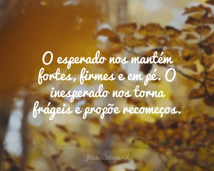O esperado nos mantém firmes, seguros e em pé. O inesperado nos torna fortes, revela como somos frágeis, nos põe de joelhos e propõe recomeços.