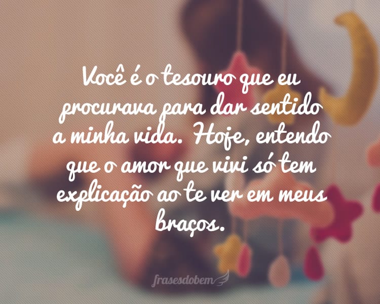 Você é o tesouro que eu procurava para dar sentido a minha vida. Hoje, entendo que o amor que vivi só tem explicação ao te ver em meus braços.