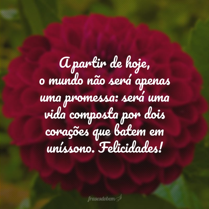 A partir de hoje, o mundo não será apenas uma promessa: será uma vida composta por dois corações que batem em uníssono. Felicidades!
